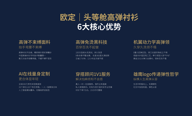 目前,欧定围绕其独特的“弹性哲学”构建了自身的核心优势。在产品功能层面,欧定采用高弹不束缚面料,结合高弹免烫科技与机翼动力学高弹领,确保着装的舒适与有型;在服务体验上,欧定通过AI定制、AI试衣、AI问搭,穿搭顾问1对1等智能化、个性化服务,为商务精英解决穿衣痛点。
