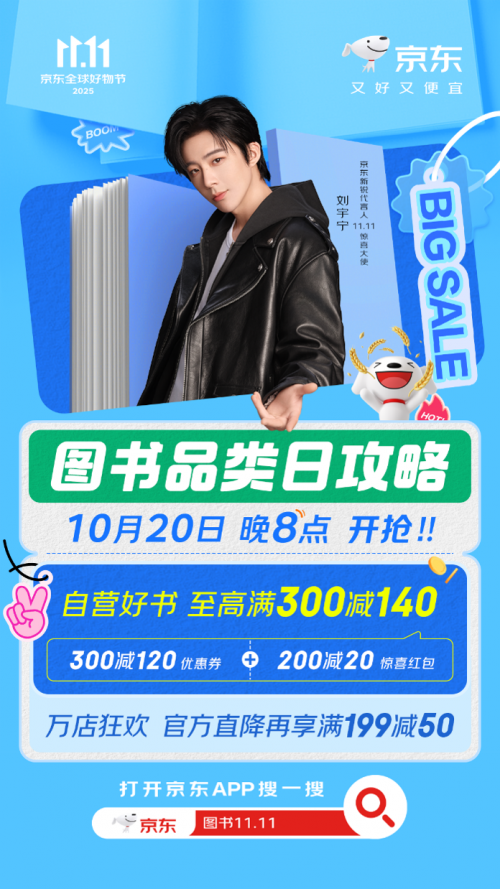 海量好书,低价来袭。10月20日晚8点,京东图书品类日活动上线,以超低价格带来涵盖国家历史、语言文字、外国文学等多元品类的海量精品好书,读者进入图书品类日会场,即可领取大额优惠券。在京东APP搜“图书11.11”参与活动,与京东11.11惊喜大使刘宇宁一起开启这场阅读盛宴,购书可叠加满300元减120元优惠券与200元减20元惊喜红包,至高可享受300元减140元,还有万店狂欢官方直降、满199元减50元优惠,真正做到让广大读者轻松低价买好书。