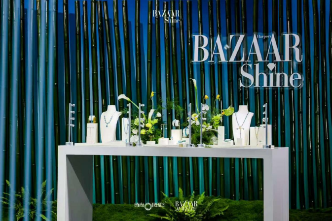 当晚的“BAZAAR Shine鎏光之夜”在竹山麻家渡镇国际珠宝交易中心璀璨启幕,将本次活动推向最高潮。华灯初上,嘉宾们沿着精心设计的绿松石主题红毯步入现场,在精心策划打造的绿松石精品主题展区驻足欣赏,流连忘返。