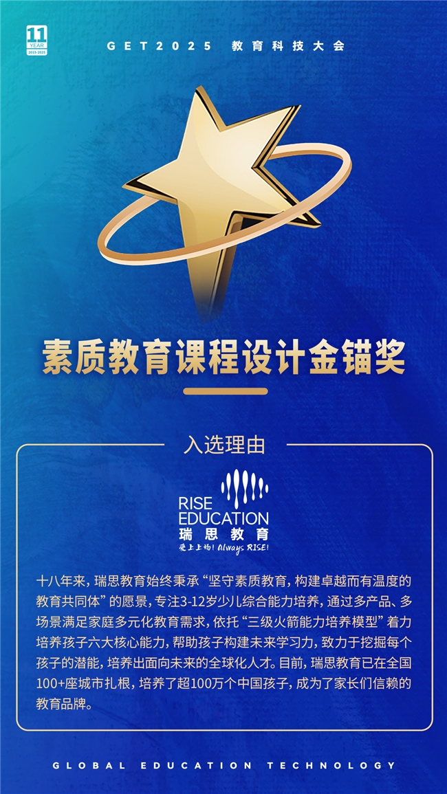 十八载的深耕不辍,瑞思教育以坚实的课程质量、卓越的教学成效与良好的口碑声誉,成为少儿综合能力培养领导品牌。此次斩获GET2025“素质教育课程设计金锚奖”,既是荣誉,更是责任。