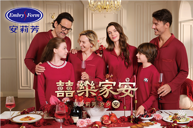「囍乐家安」蕴含着安莉芳真挚的新年祝愿与人文关怀:“囍”是两人相伴的默契同心;“乐”是孩童无忧的纯真笑语;“家”是灯火可亲的团圆美满;“安”则是内心那份从容不迫的底气与安然状态。安莉芳将这份祝福织入每一件内衣中,寄托着“穿安莉芳,岁岁安”的美好愿景。