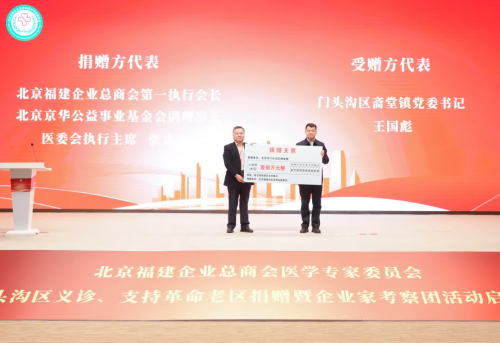 接着举行北京福建企业总商会医学专家委员会支持革命老区捐赠仪式。总商会第一执行会长张志雄代表北京福建企业总商会医学专家委员会向门头沟区斋堂镇捐赠100万元,捐赠资金将用于斋堂镇推动美丽乡村建设与乡村产业健康发展,缓解村民及游客“停车难”问题和保护与优化斋堂镇水库周边生态环境。