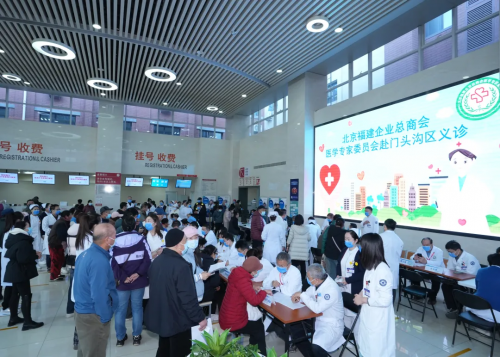 在北京京煤集团总医院门诊大厅,电子大屏幕上打出“北京福建企业总商会医学专家委员会赴门头沟区义诊”大字,十分醒目,印有义诊团专家情况的简介图板分列屏幕两侧。两排桌子前,各位专家的名牌前,都已经排起了长长的队伍。在本院医生的引导下,专家们各就其位,迅速进入了工作状态。