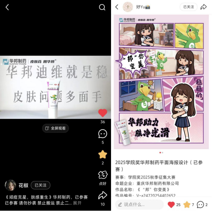 大赛期间,众多高校学子主动分享个人创意作品,掀起了一场聚焦爱肤健康创意的“青春传播热潮”。这些亮眼作品贴合品牌特性且符合年轻群体审美偏好,发布后相关内容的互动数据持续增长,不仅为华邦迪维注入了传播活力,更为爱肤品牌搭建了与年轻用户深度联结的创意纽带。