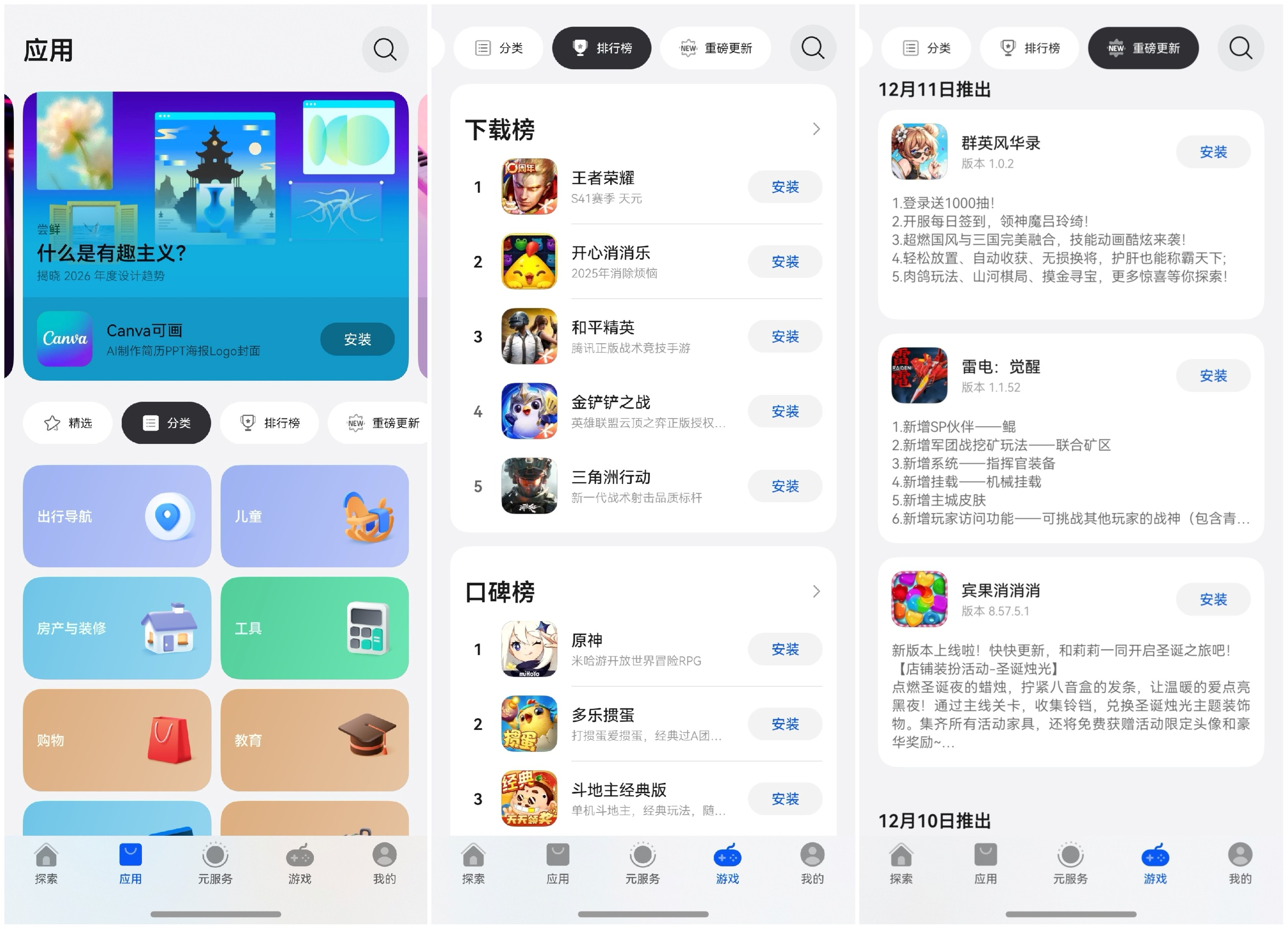 体验路径:打开AppGallery,在“应用”或“游戏”页,点击腰部的“分类”、“排行榜”或“重磅更新”查看