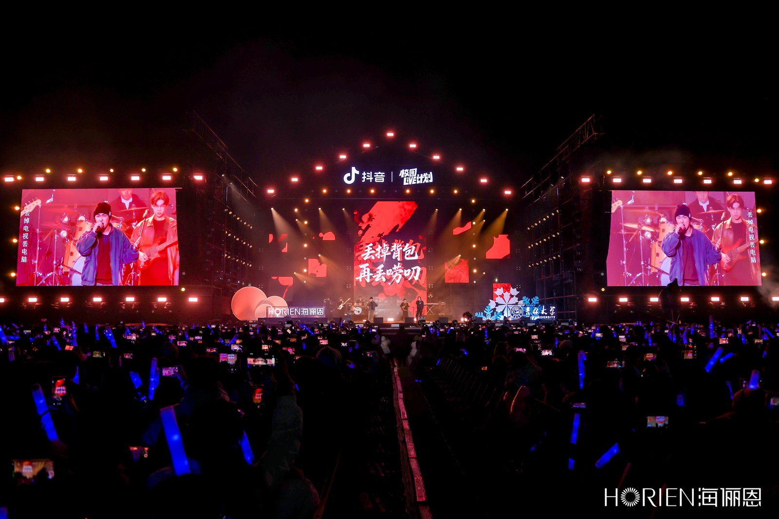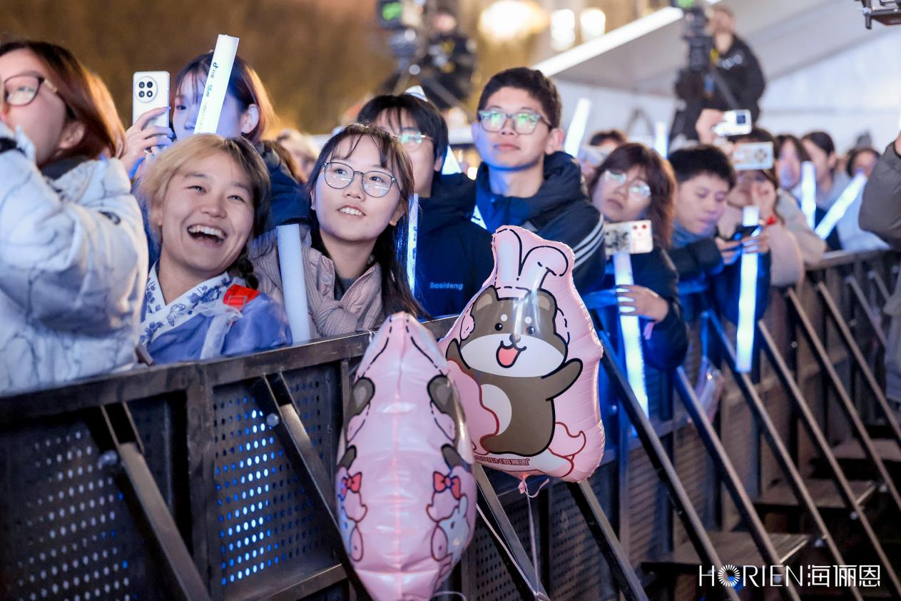 这份温暖的最后一站,定格在当晚的校园Live舞台。当灯光缓缓亮起,三个橙色圆圈温柔环抱着海俪恩logo,大雪花blingbling地闪着光,整个舞台就像一座「冬日限定温暖小屋」直接空降吉大!音乐一响,冷空气都被音浪震退,现场秒变大型聚众蹦迪现场~通过环境氛围的精心营造,海俪恩成功地将线下空间转化为情感共鸣场,让学子们在音乐与光影的交织中,自然而然地接纳品牌所传递的温暖陪伴理念。