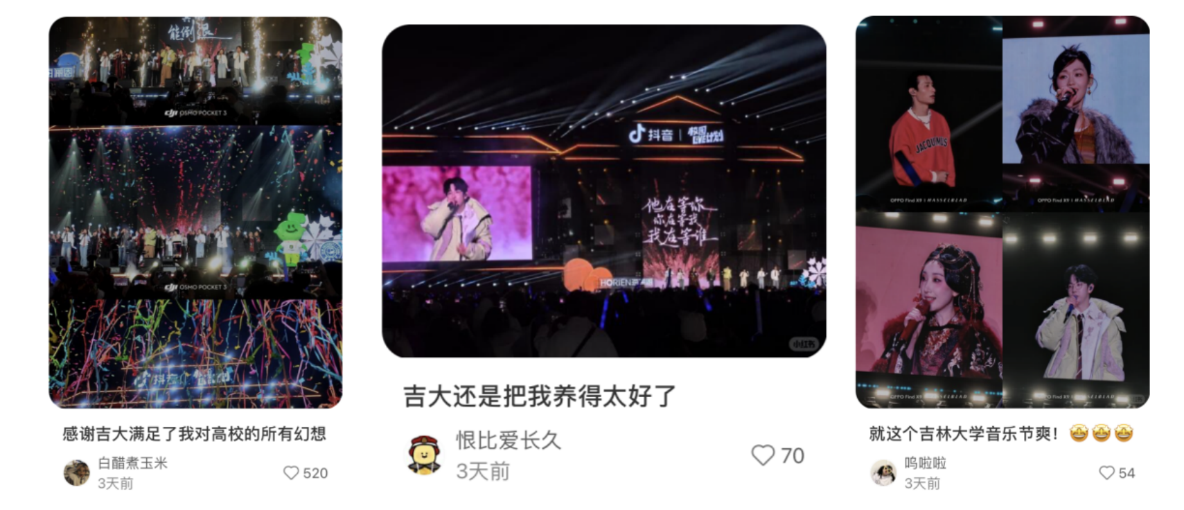 随着演出进行,舞台的巧思开始显现。光束流转间,“恩恩蓝”与晶莹的雪花元素在夜色中交织,仿佛把北国的浪漫都装进了这个冬日夜晚。不少学子在社媒上晒出自己的“观演心得”:“就这个吉林大学音乐节爽!你怎么知道我在学校见到了李大奔、等什么君、段奥娟、胡夏!就这个现场听歌爽!吉林大学我们喜欢你!”、“感谢吉大满足了我对高校的所有幻想!”、“吉大还是把我养得太好了”、“这才是我们吉大人该看的演唱会!”……