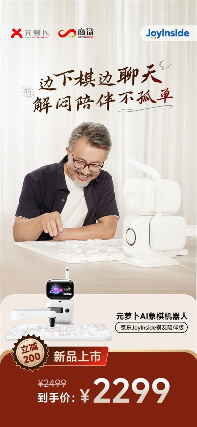 即日起,元萝卜AI象棋机器人——京东JoyInside棋友陪伴版在京东独家发售,零售价2499元,新品上市优惠200元,到手价2299元。未来,元萝卜还将持续深化布局智慧养老场景,以创新科技构建更幸福、更便捷的智能化生活。