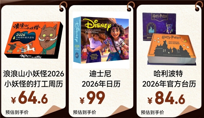 阅读的陪伴,同样可以源于情感的共鸣与文化的浸润,那些承载着共同记忆的日历,更能精准连接个体的兴趣与情怀。《浪浪山小妖怪2026打工周历》巧妙化用热门国漫IP,以幽默方式定格职场日常,到手价64.6元再赠精美电影海报;《迪士尼2026年日历》与《哈利·波特2026年官方台历》则分别以治愈插画和魔法细节,唤醒温暖回忆与奇幻想象。