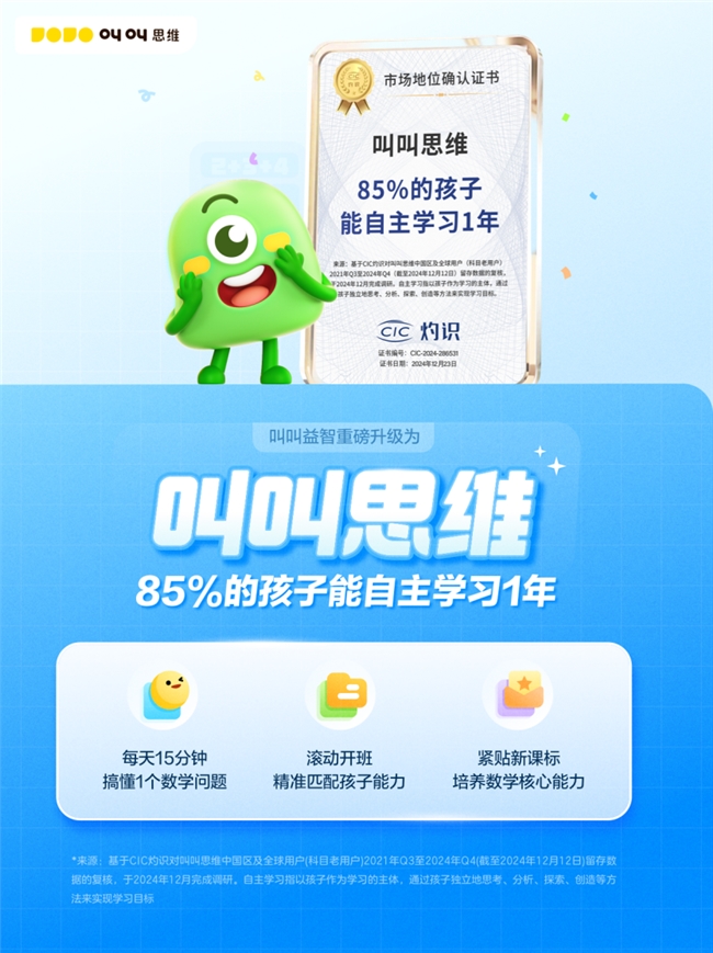 事实上,这并非叫叫思维首次获得行业权威认可。此前,叫叫思维还获得新浪 & 微博 “2024 年度教育科技创新影响力品牌” 奖项,该奖项聚焦教育品牌的科技创新能力与市场影响力,进一步印证了叫叫思维在教育科技融合领域的领先地位。2024 年,全球知名行业咨询与顾问公司 CIC 灼识基于对叫叫思维中国区及全球用户 2021 年 Q3 至 2024 年 Q4 的用户留存数据进行深入分析后,给出了 “85% 的孩子能在叫叫思维自主学习 1 年” 的权威认证。这意味着在叫叫思维,每 100 名孩子就有 85 名能够持续坚持完成全年 50 周的学习内容,并通过独立思考、分析、探索、创造等方法顺利实现学习目标。数据认证不仅充分印证了叫叫思维对儿童认知规律的精准把握,更彰显了产品对用户的强大吸引力和模式的有效性。