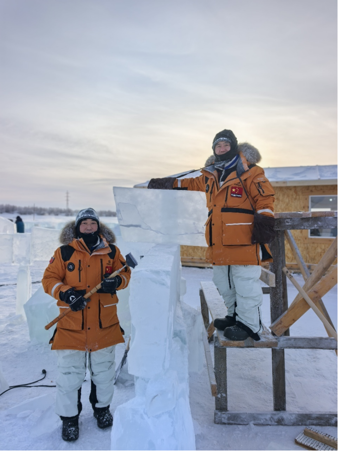 雅库茨克素有“冰城”之称,建在永久冻土层之上,1月平均气温低至-38.6℃,极端最低温可达-64.4℃,全年温差超100℃,是全球大陆性气候最典型的城市。对于冰雪雕艺术家而言,这里的创作环境堪称“极限恶劣”:长时间户外作业需抵御刺骨寒风与持续低温,雕刻动作要求装备兼具保暖性与灵活性,而大量运动产生的湿气又极易导致衣物受潮,进一步加剧寒冷侵袭。“在这样的环境下,一套可靠的防寒装备不仅是保暖需求,更是保障创作顺利进行的基础。”中国艺术家团队负责人坦言,在赛前筹备阶段,如何应对极寒环境成为团队最核心的考量之一。
