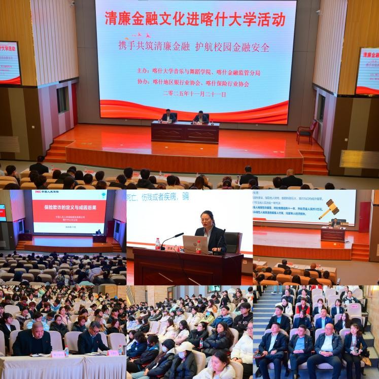 为提升高校学子金融安全意识,践行“人民保险 服务人民”的企业使命,2025年12月12日,人保寿险喀什中心支公司以国家金融监督管理总局喀什金融监督管理分局牵头开展“清廉金融文化进大学”活动为契机,组织反保险金欺诈专题宣传,为喀什大学师生送上实用的金融安全“必修课”,参会人员有喀什大学师生领导、喀什金融监管分局及辖内银行保险工作人员,共计230余人。