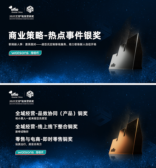 2025艾菲效果营销奖揭晓获奖名单。屈臣氏多项营销案例脱颖而出,揽获“一银三铜”多项大奖,并获得“2025艾菲效果营销奖年度品牌排名TOP 3”称号。其中,《职场新人季:漂亮面对》营销项目荣获“商业策略-热点事件”专项类银奖。《和小黄人一起来屈臣氏挖宝》《新奇试物所》和《玩美出行,屈臣氏有方》项目,则分别获得“全域经营-品效协同(产品)” “全域经营-线上线下整合”和“零售与电商-即时零售”铜奖,为零售行业的创新营销实践打造卓越范本。