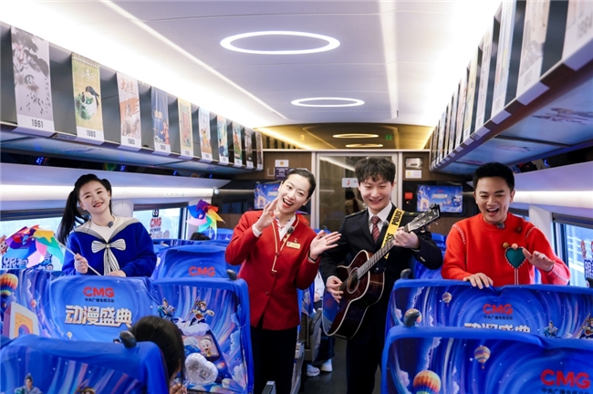 旅客们登车踏入车厢那一刻,犹如进入一座“动漫城堡”,车厢内到处是熟悉的动漫元素,氛围感十足。旅途中,金豆哥哥、徐柳姐姐与动漫专列的特邀旅客和动漫迷们进行了许多妙趣横生的小游戏,列车乘务员也为大家送上了耳熟能详的动漫歌曲,整趟旅程充满着欢声笑语。