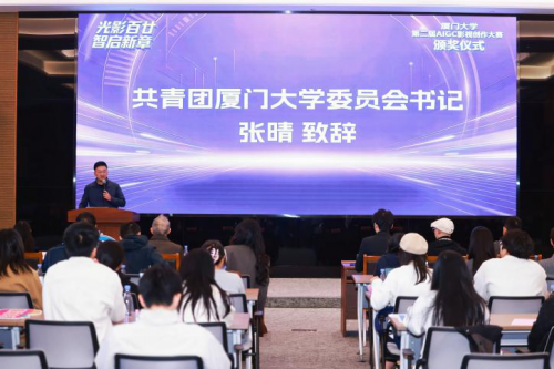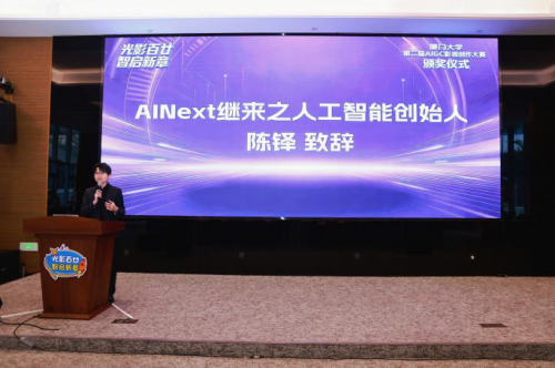 在颁奖仪式上,共青团厦门大学委员会书记张晴代表主办方致辞。他在致辞中回顾了去年首届大赛的成功举办,并对本届赛事给予了高度评价。他表示,“本届大赛是厦门大学深化‘影视+思政’、‘技术+育人’融合探索的又一次生动实践。看到来自全国各地高校的优秀学子,将纪念中国电影诞生120周年的历史情怀、抗战胜利80周年的和平信念、教育强国的时代使命以及嘉庚精神的红色基因,通过AIGC技术进行创新表达,感到非常欣慰。”AINext继来之人工智能创始人陈铎在致辞中则表示在致辞中提到,AIGC已成为青年创作者手中“跃动的画笔”,它不仅降低了创作的门槛,更极大地拓展了想象力的边界,未来将强化校企联动,加速技术成果转化。