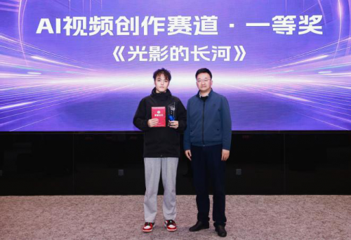 在万众瞩目中,颁奖仪式迎来了最激动人心的颁奖环节。本次比赛共评选出一等奖2名,二等奖4名,三等奖6名,优秀奖13名,颁奖环节“AI剧本创作”与“AI视频创作”两个赛道的获奖者依次上台领奖。随后,依次颁发本届大赛“AI剧本创作”与“AI视频创作”的优秀奖、三等奖、二等奖和一等奖(详细获奖名单请看推文最底部)。获得AI剧本创作赛道一等奖的创作者获得者林梓瑜率先上台分享自己的创作心得,他表示自己的作品《光影赴星河》表达了对中国电影120年传承的理解,“工具一直在变,但‘记录时代、传递真情’的初心从未改变。”获得AI视频创作赛道一等奖的创作者获得者候自恒则带来了深刻的行业思考,他表示AI可以复刻风格,但真正的温度需要创作者去理解和表达。
