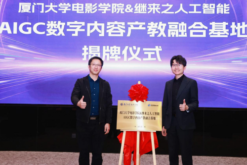 在全场嘉宾和师生的见证下,高斌和陈铎分别代表厦门大学电影学院与继来之人工智能公司,为双方合作共建的正式揭牌成立“AIGC数字内容产教融合基地”揭牌。这个基地的落成,是电影学院与影视是高校与产业深度融合的新起点探索,更是一条连接创意、技术与人才的新通道的开启。