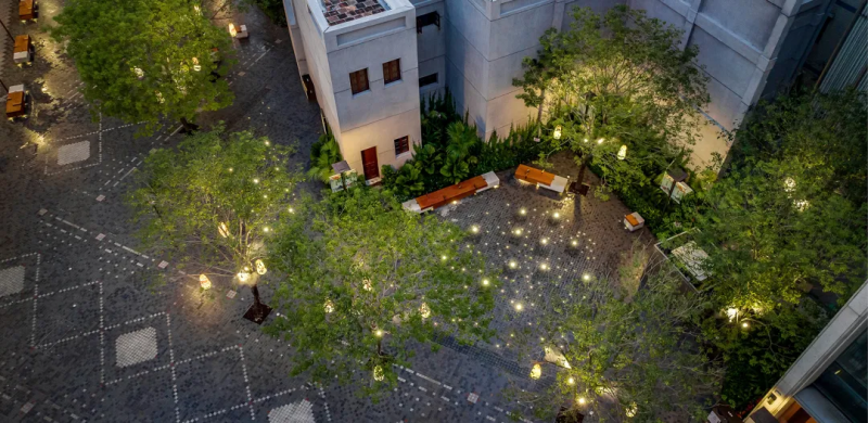 作为课题核心研究对象,永庆坊三期项目的景观设计深度践行“微改造”理念,实现历史文脉保护与空间功能升级的有机统一。其中,永庆坊金声广场原址为沉寂的历史场所,随着金声大剧院重建重获新生,设计团队以低干预模式延续街区原有肌理,同时重塑空间流线,增强空间连接性与渗透性,将古建筑群与历史民俗活动相结合,最大化激发街区商业活力。