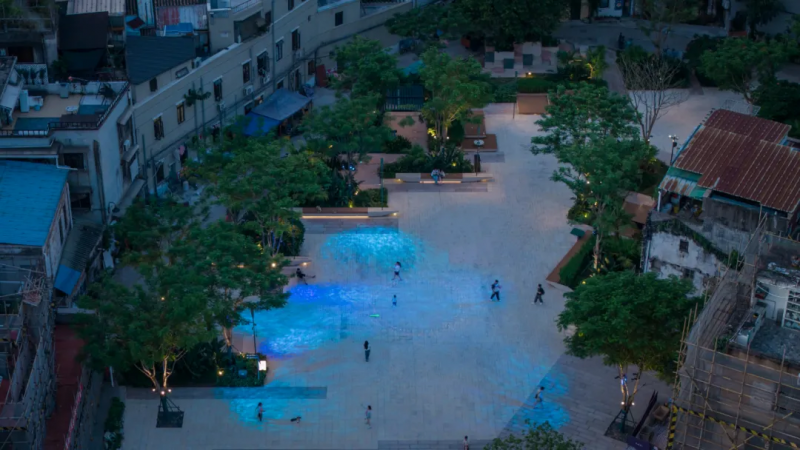 永庆坊吉祥广场与大地广场的改造则聚焦民生需求,原址为恩宁涌水尾处杂草滋生的L形“边角地”,长期阻碍居民出行。2022年项目入选广州市首届“老城新生”伙伴计划后,设计团队深入调研西关文脉,聆听原住民对亲水空间、林荫休憩地、活动场所的需求,最终将其打造为集休闲、聚会、娱乐与艺术展示于一体的活力公共空间,有效缝合历史街区肌理,唤醒在地乡愁记忆。