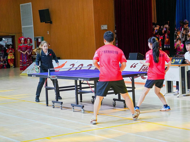 互动体验环节设置了壮族打榔舞、背篓接绣球、壮拳等多个民族传统体育项目,特别邀请非遗代表性传承人现场教学,讲招式、讲故事、讲文化:“壮拳不仅是技艺,更是一种精神。”运动员与师生们在“一招一式”中,体会中华优秀传统体育文化的深厚底蕴。在乒乓球友谊赛中,刘诗雯带来专业示范与教学。学生双打、退役队员挑战、趣味球拍对抗轮番登场,全场欢笑不断。一名学生激动地说:“冠军离我们并不遥远,他们认真、努力、乐观的样子,就是我们最想学习的体育精神。”