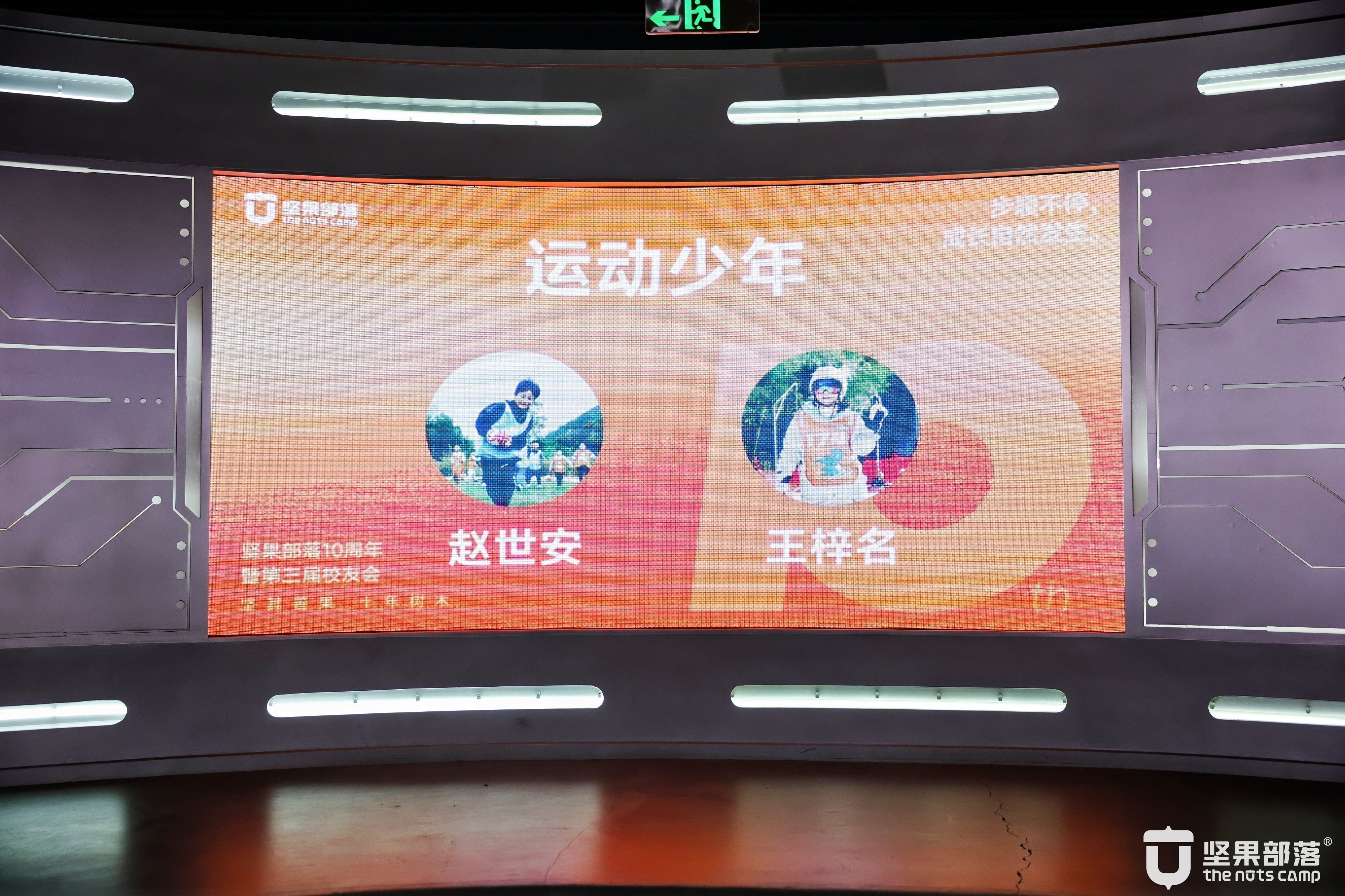 校友会现场,坚果部落颁发了“勇气演说家”、“登山少年”、“运动少年”、“远征少年”、“少年领导力”等多项荣誉,表彰在户外探索中表现突出的孩子们。并将“坚果精神代言人”奖项授予三位持续成长的老营员:冯逸程、汪汇禹与姚思延。