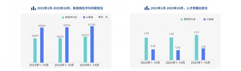 近日,脉脉高聘发布《2025年度人才迁徙报告》(以下简称《报告》)。《报告》显示,2025年1-10月,人才求职压力增加,新经济行业整体人才供需比升至2.23,相当于2.23个人争夺1个岗位,创下近三年新高。初阶职场人求职压力大,面向1年以内工作经验的新发岗位量下降40%。AI人才供需比首次超过1,进入人才供大于求的状态。