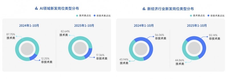 2025年6月开始,招聘市场逐渐回暖,6-10月新经济行业整体新发岗位量超过去年同期。新发AI岗位量、出海岗位量均保持增长。2025年1-10月,AI岗位量同比攀升543%,单月同比增幅最高超过11倍。出海岗位量同比增长16.99%。