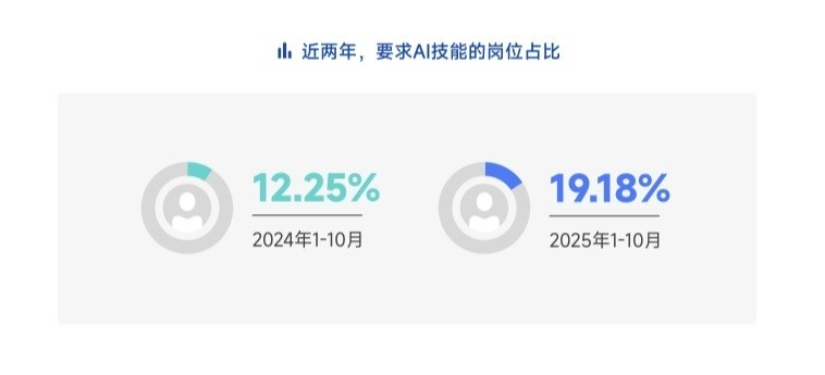 AI技能成为企业招聘⼈才时的重要要求。2025年1-10月,岗位要求中明确包含“AI”、“⼤模型”、“⼈⼯智能”等关键词的新发岗位占⽐达到19.18%,较2024年同期的12.25%提升约7个百分点。