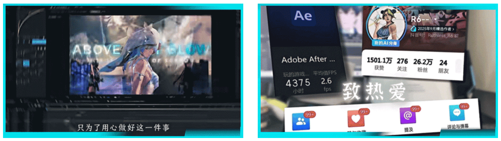 还有同样为创作付出数年心血的@R6-- ,凭借“用心去创作一定没错”的信念,她在三年时间里创作了20位JOJO单角色剪辑、15条鸣潮单角色篇以及近百条混剪视频,她会为了一条视频连续爆肝20多个小时,也会用动漫中的“黄金精神”坚持高质量二创,剪辑软件中超过4000小时的使用时长就像是努力的“勋章”。