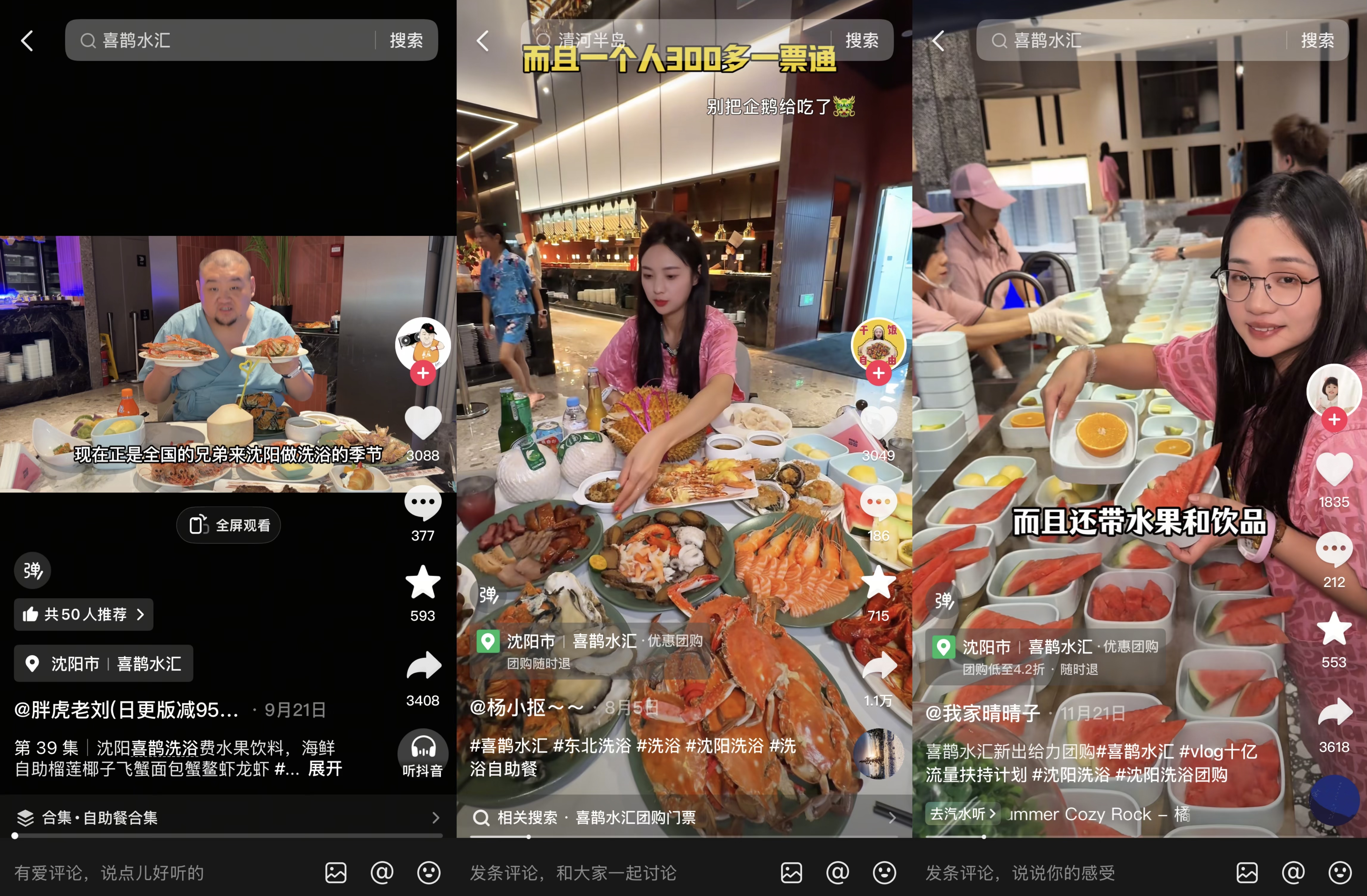 抖音生活服务相关数据显示,今年平台上“洗浴中心”的搜索量同比增长36%,而搜索后的成交额增长高达64%。18—23岁的年轻客群订单增长了59%。不只是喜鹊水汇与浙足轩,还有很多洗浴商家正通过庞大的流量、沉浸式的内容生态与高效的交易闭环,加速成长。