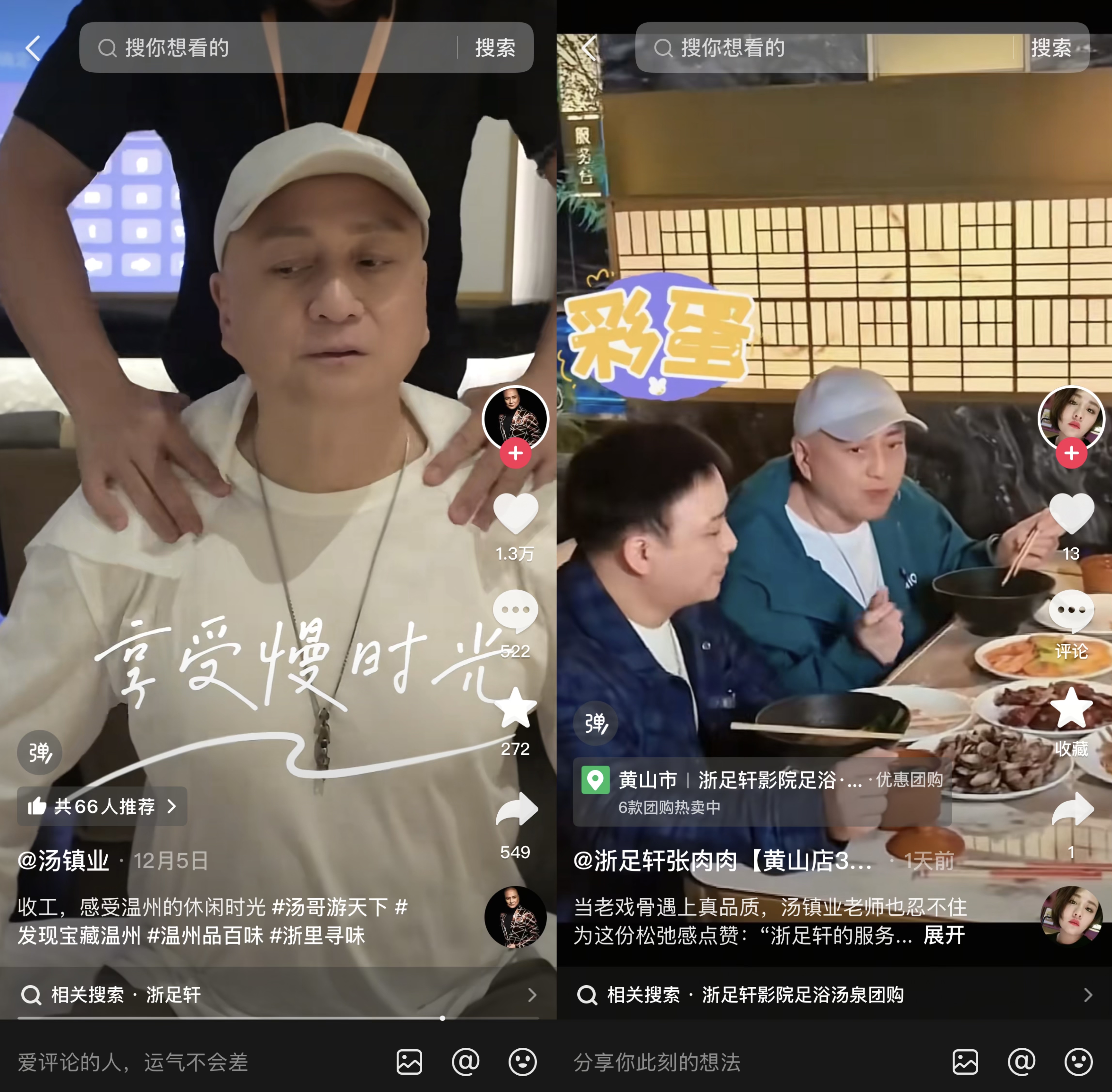 此外品牌也积极参与了此次洗浴季活动,汤镇业等明星也去到了浙足轩温州旗舰店探访并发布内容。并且品牌发布内容会统一带上活动话题标签,借活动关注度提升自身曝光效率。