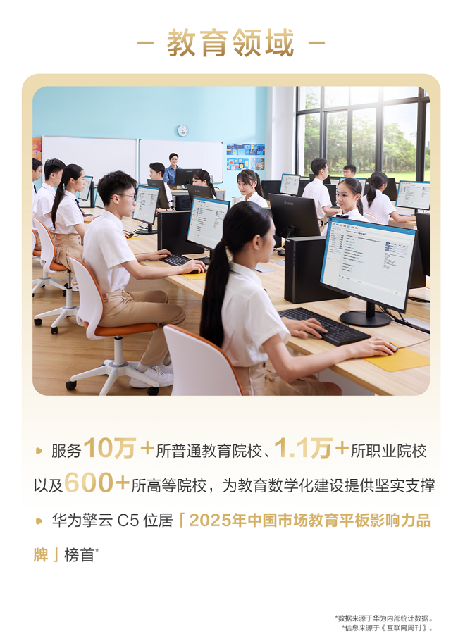 在教育领域,华为擎云 C5在德本咨询发布的《2025年中国市场教育平板影响力品牌》中位列榜首,品牌目前已服务超过11万余所院校,夯实了教育新基建的底座。