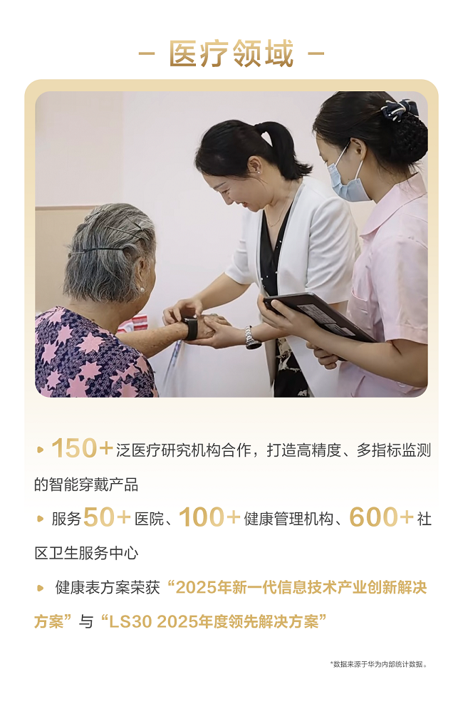 在医疗行业,华为擎云与150+泛医疗研究机构合作,打造高精度、多指标监测的智能穿戴产品,服务50+医院、100+健康管理机构、600+社区卫生服务中心,推动健康管理智能化、数字化、可视化。此外擎云智慧医疗-健康表方案还获得权威媒体颁发的2025年新一代信息技术产业创新解决方案与LS30 2025年度领先解决方案奖。五大关键领域的规模化落地,不仅刷新了市场成绩单,更印证了华为擎云在全场景赋能数字化转型上的深厚功力。