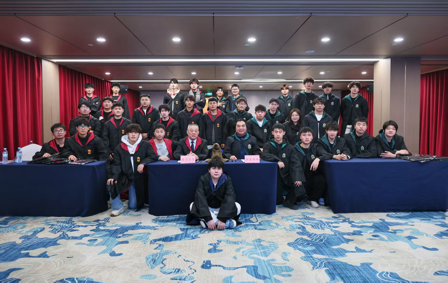 当日16时30分,备受期待的跨年嘉年华“大学冰球奇妙夜” 如期而至。本次嘉年华由11支总决赛参赛队伍共同参与,每队选派3名运动员和1名守门员。值得一提的是,赛前领队会上两大阵营的组建环节充满了奇幻色彩 —— 活动现场由一顶“会思考”的“魔法分院帽”进行分组,并由分院院长为各自成员分发队服,最终组成红色队服的“狮院”与绿色队服的“蛇院”两大阵营,一场充满奇幻色彩的冰上对决正式开启。
