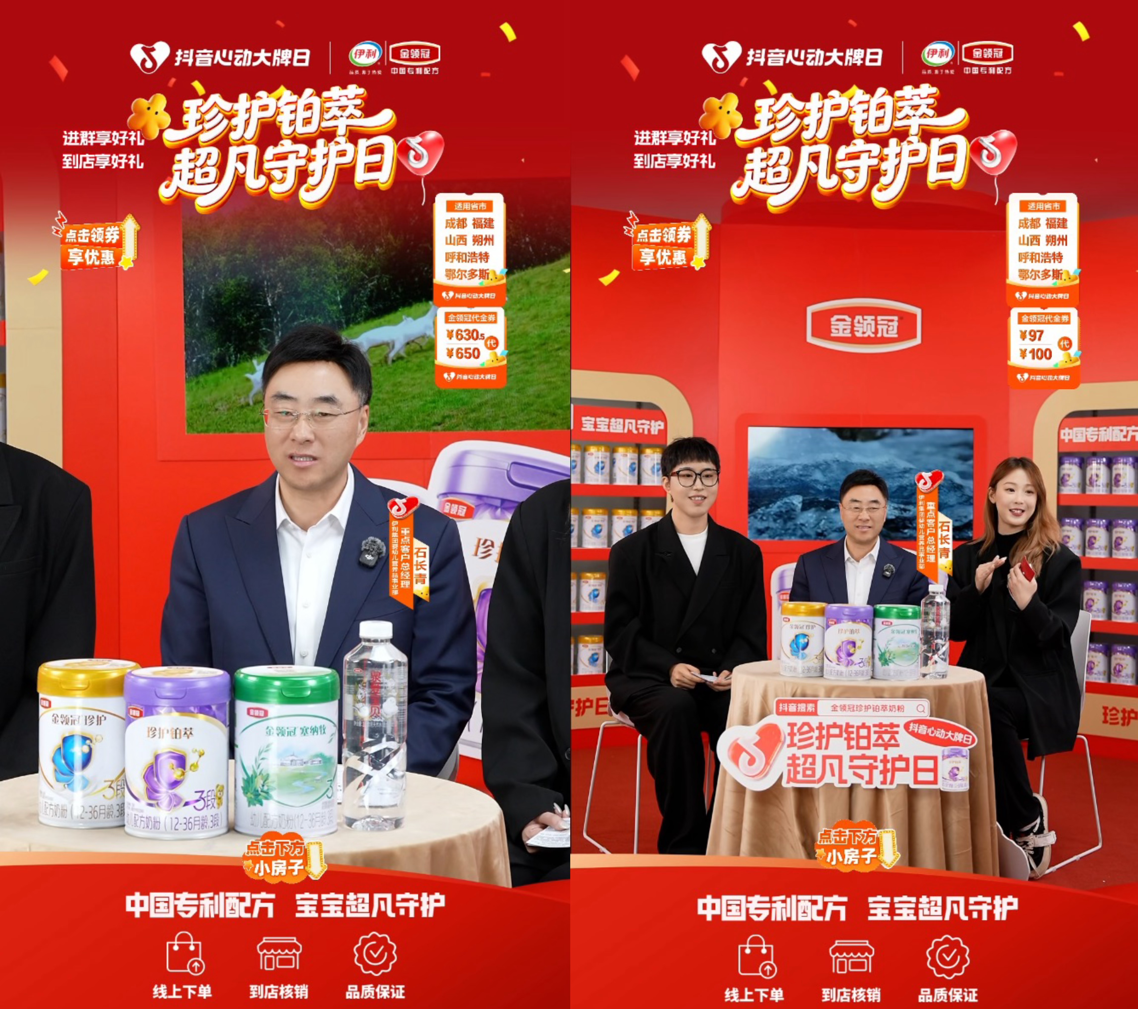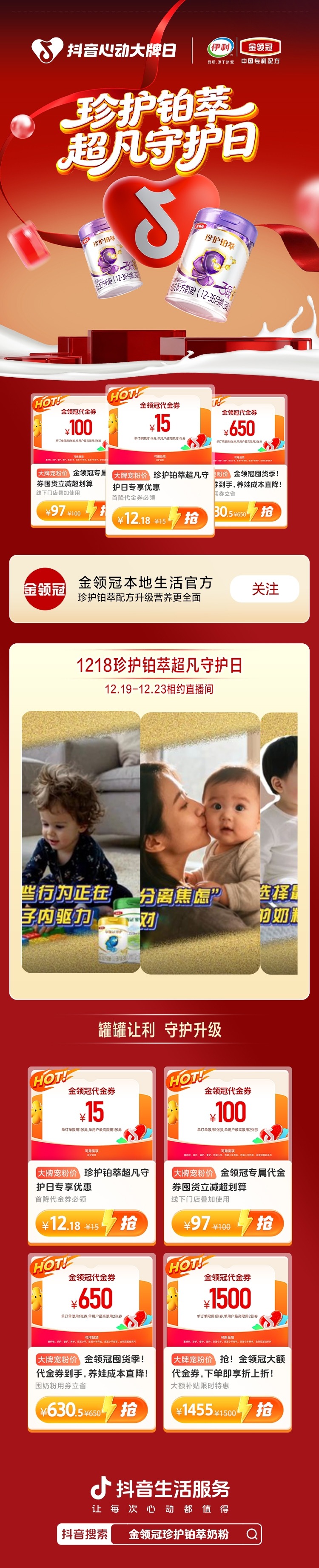 本次与「抖音心动大牌日」的合作,恰逢金领冠第三届“1218珍护铂萃超凡守护日”启幕。品牌以此为契机,联动平台与全国渠道,落地“百城千场童乐汇”大型线下活动。同时,在线上推出直击用户囤货需求的诚意优惠:97抵100元通用券、12.18抵15元珍护铂萃专享券、1455抵1500元囤货季券,让尖端营养科技以更友好的方式融入万千家庭。
