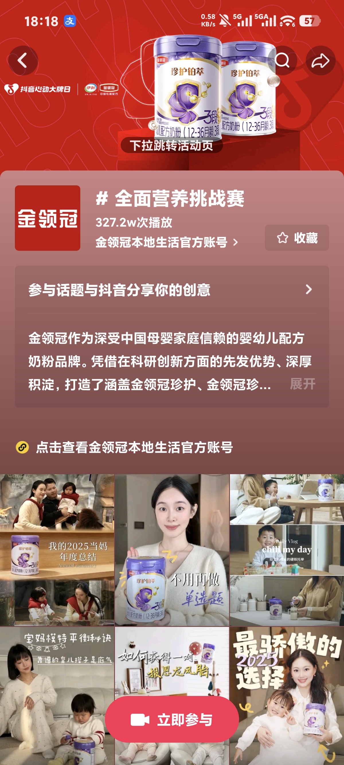 伊利金领冠品牌经理的深度参与,则为直播间注入了专业的亲和力与趣味性。借助 《谁是卧底》、emoji猜品牌等轻快互动游戏,在密集派发代言人周边及产品正装的福利氛围中,将“六维营养”知识巧妙融入,化硬核科普为轻松记忆。同期线上发起的 #全面营养挑战赛,迅速集结 @荃荃妈咪 @亿亿ELeven @一只小南瓜 @南宁一姐 @等等小刺猬 @污里叉叉等十余位头部母婴达人,通过创意短视频将科研概念生活化、场景化,不仅为直播间持续引流,更在平台内形成了跨圈层的内容共振,实现了品牌信息的多维度渗透与情感共鸣。