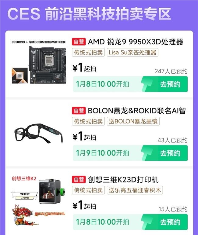 针对多款最具代表性的展会新品,京东还推出了“CES全球新品1元起拍”活动,涵盖智能眼镜、3D打印设备及处理器等多个品类,均可在京东拍卖1元起拍。创想三维K2 3D打印机搭配稀缺款乐高、AMD锐龙9 9950X3D处理器(LISA SU签名款)、暴龙与Rokid联名款AI智能眼镜等稀缺尖货均将于1月8日10点起陆续开拍。