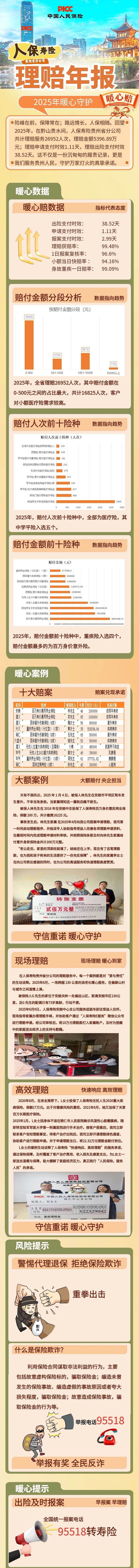 险峰在前,保障常在;路远情长,人保相随。回望2025年,在黔山贵水间,人保寿险贵州省分公司共计理赔服务26952人次,理赔金额5396.89万元;理赔申请支付时效1.11天,理赔出险支付时效38.52天。这不仅是一份沉甸甸的履责记录,更是我们服务贵州人民,守护万家灯火的真挚承诺。