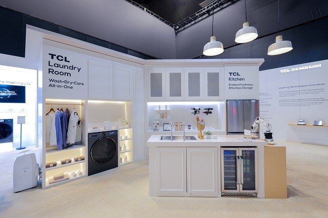 而在冰洗领域,TCL实业同样展出定义健康高品质生活的全新产品。TCL新一代AI健康鲜储冰箱GeniusFresh系列冰箱搭载WIFI智慧科技,其配备T-Fresh与Pure Air全空间除菌净味系统,能高效分解异味,持久守护食材原鲜;结合金属背板、大变温空间、灵活悬梁臂搁架、自动制冰机等配置,让用户畅享品质生活。此外,本届CES展出专为北美家庭打造的28'大容量AI超级筒洗烘一体机,以5.5立方英尺超大容量,一机容纳全家衣物,省时省水更省心。同时其搭载AI超级筒技术,以多重传感器智能匹配水温、水流与转速,配合洗烘一体全程接力,带来高效轻松的洗护升级。