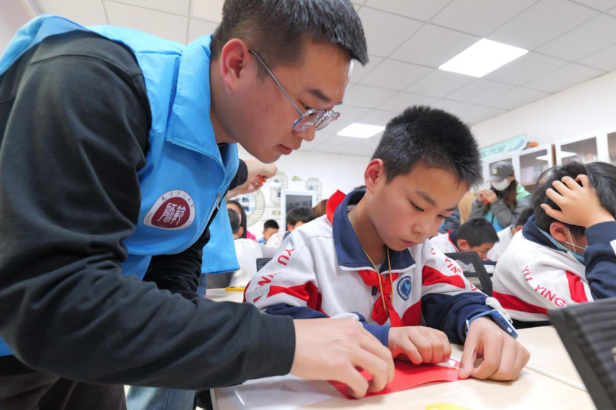 (图为志愿者与同学们共同制作红旗)