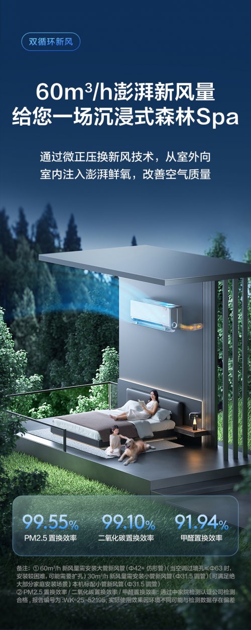 此外,TCL小蓝翼P7 Ultra AI健康空调还具备双循环新风功能,60m³/h的澎湃新风量,就像一场沉浸式森林Spa。通过微正压换新风技术,它从室外向室内注入鲜氧,改善空气质量。其PM2.5置换效率高达99.55%,二氧化碳置换效率为99.10%,甲醛置换效率达91.94%,让用户在睡眠中也能呼吸到清新、健康的空气。