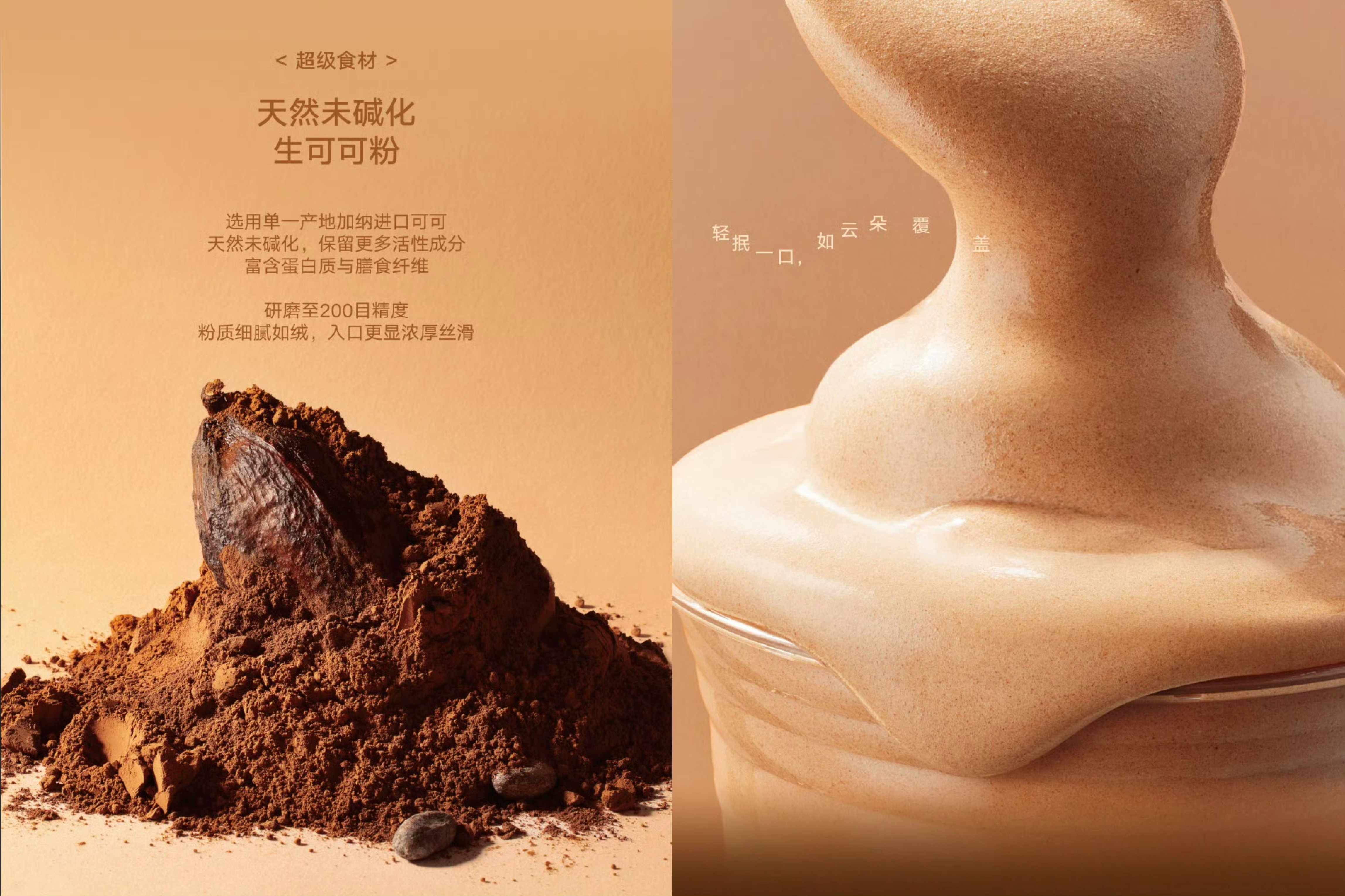 原料端,产品延续奈雪高品质基因:核心原料采用超级食材——加纳进口单一产地天然未碱化生可可粉,保留可可豆中更多活性成分、蛋白质与膳食纤维,兼具健康属性与浓郁本味;经200目精细研磨工艺处理,粉质细腻如绒,奠定醇厚基底。茶底则甄选云南景迈山红茶,自带馥郁花果香气,与可可风味形成巧妙平衡,增添风味层次的同时,让浓醇口感更显高级。