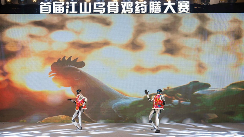 在本次药膳大赛的开幕环节,身着喜庆大花袄、佩戴江山乌骨鸡徽章的智能机器人与活泼可爱的小演员们同台表演了江山乌骨鸡推广宣传曲《闻鸡起舞》。