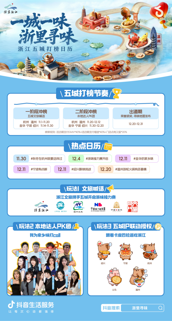 在当前消费市场追求深度体验与本地文化的大趋势下,如何有效整合区域资源,打破地域壁垒、激活消费潜力、实现商业价值与文旅品牌的双向赋能,是各地政府文旅与商业平台共同关注的话题。近期,抖音生活服务携手浙江省文化广电与旅游厅及杭州、宁波、金华、温州、绍兴五城文旅局打造的“一城一味・浙里寻味”五城商家打榜赛,以“政务背书+IP赋能+明星/达人矩阵+产品创新”的四维一体策略,构建了一场覆盖近3万商家的城市营销事件,为本地生活与文旅产业融合发展提供了一份可借鉴的区域营销范本。