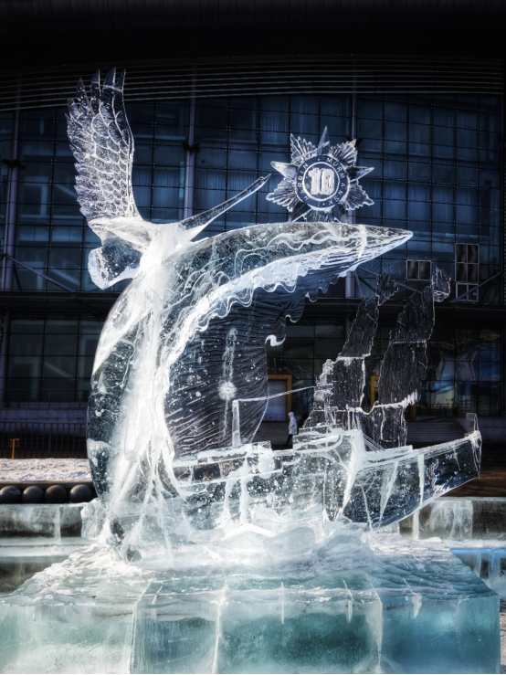 冰雕《星汉同辉》包含天鹅、列宁号核动力破冰船等元素,主体由慢慢融化的半月组成,底部幻化为冰雪陆地,代表着两座北方城市的冰雪特色。浪花和冰代表着哈尔滨松花江及摩尔曼斯克北极圈海港的场景,月亮与右上角10周年纪念徽章的光芒相呼应,日月也在另外一个层面代表两座友好城市10年的交往,如繁星与银河交相辉映。雪雕《噬》既展示了人类对AI技术的贪婪索求,也展示了AI的反向侵蚀,借此叩问技术伦理的边界,警示在智能时代中人类对自身主体性的坚守。两件作品细腻的线条、灵动的层次,无不彰显着艺术家们的匠心巧思,而这一切的完美呈现,离不开探路者专业装备的全方位守护。