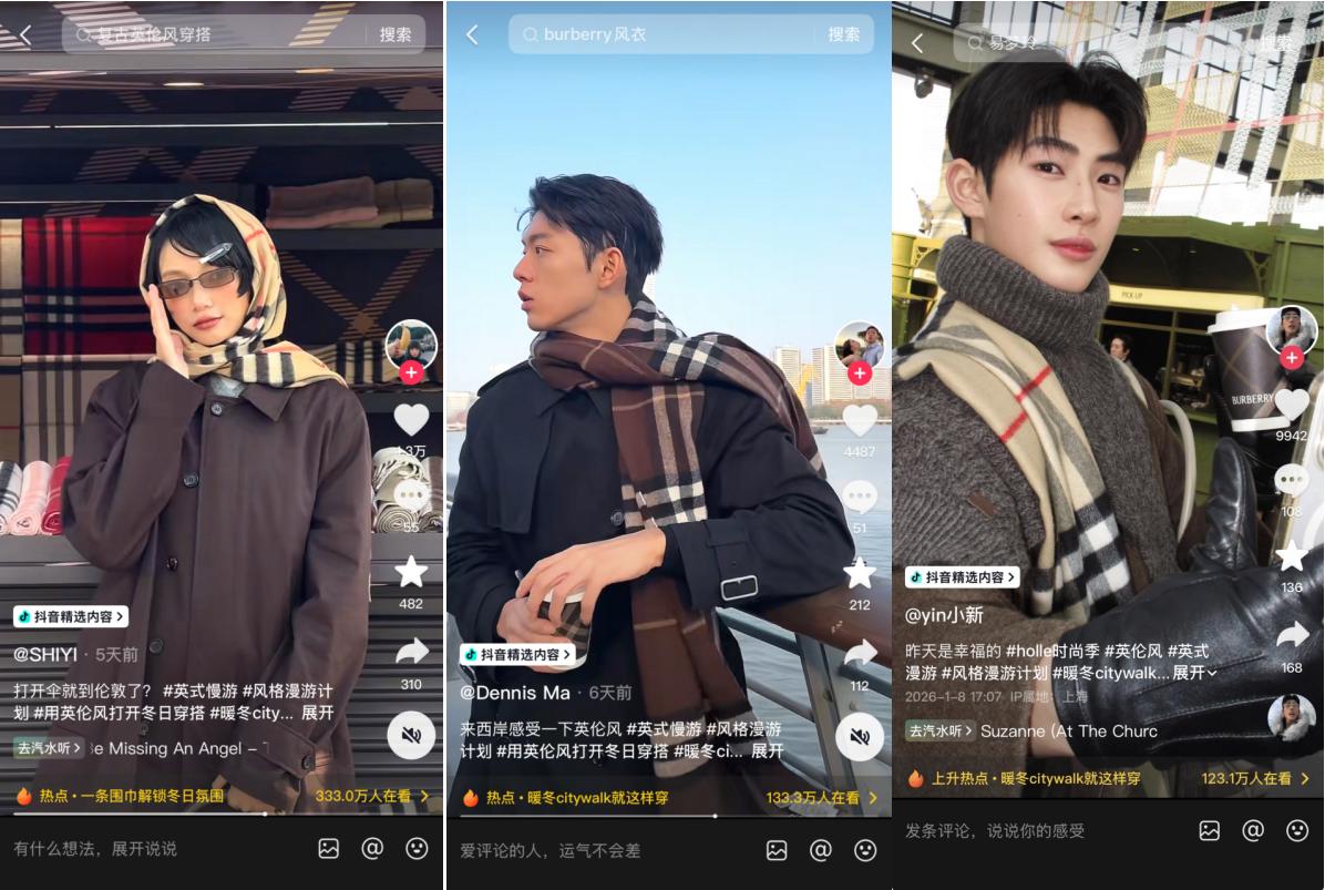 近期,抖音时尚发起「风格漫游计划」,聚焦城市通勤、校园生活、户外出行三大高频场景,通过 #都市游猎风、#英伦学院风、#假日漫游风 ,邀请创作者与用户共同探索穿搭与生活场景的深度结合。与此同时,抖音时尚也与BURBERRY展开以「英式慢游」为主题的线上线下联动,在2026年开端,让风格不止于观看,更成为可参与、可体验的生活内容。