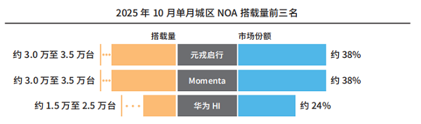 市场份额的快速攀升印证了其行业认可度。在城区 NOA 这一核心赛道,元戎启行从前期的追赶者快速成长为并列领跑者,10 月单月约38% 的市占率,不仅体现了其技术方案的竞争力,更彰显了其在主流价位市场的渗透能力。