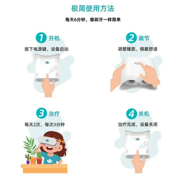 它采用人性化手持式设计,亲肤材质搭配人体工学造型,单手即可操作;使用流程更是简单高效,每天只需2次,每次3分钟,累计6分钟就能完成一次防控干预,无论是早上起床后、晚上睡前,都能轻松安排,完全不占用孩子过多学习和休息时间。