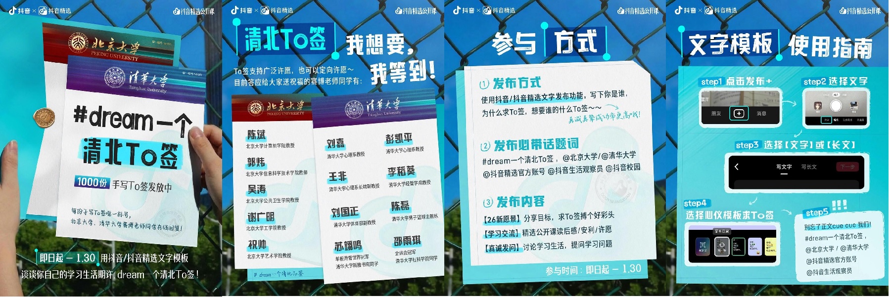 用抖音精选App或抖音App,投稿分享你的课程学习故事 / 人生困惑 / 新年进步愿望,并带上话题 #dream一个清北to签 @清华大学 / @北京大学 @抖音精选官方账号 @抖音校园 @抖音生活观察员。优质投稿,将有机会获得限量版to签。