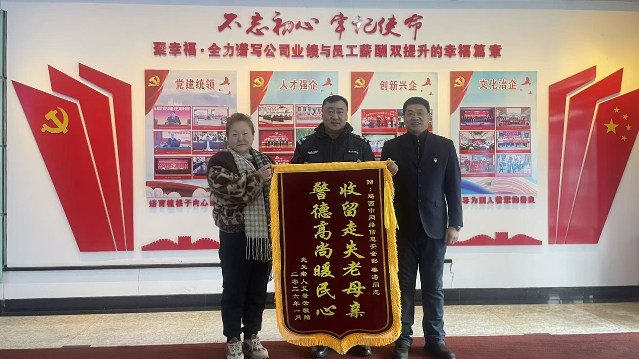 近日,刘女士专程前往中国联通鸡西分公司,将一面印着“收留走失老母亲 警德高尚暖民心”的锦旗送到网络与信息安全部,以此感谢安保员姜涛寒冬深夜践行服务初心、救助其走失母亲的暖心善举,也为联通延伸服务边界、传递服务温度的担当点赞。 事情发生在2025年11月30日凌晨2时15分,东北冬夜气温骤降至零下二十度,寒意刺骨。姜涛在例行安全巡查时,始终秉持“服务无界、关爱随行”的意识,发现公司大门外有位仅着内 衣、赤脚的老年妇女瑟瑟发抖,意识模糊且无法提供身份信息。他第一时间将老人接入温暖的门卫室,贴心递上热水、披上衣物,用细致服务为老人驱散严寒,同时迅速拨打110求助。 警方快速匹配到走失警情,20分钟后家属便匆忙赶到现场。面对家属当场拿出的2000元酬谢,姜涛坦然婉拒,坦言:“这是我们该做的,服务群众不分岗位、不分场合。”姜涛的举动,不仅彰显了国企员工的社会责任感,更将中国联通“客户为本、服务至上”的价值观落到实处,把服务从工作场景延伸至民生一线,这面锦旗正是对鸡西联通优质服务与人文关怀的最真切认可。